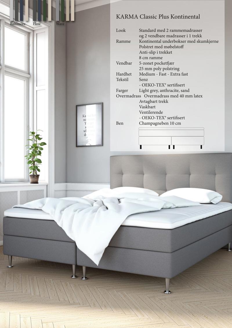 KARMA Classic Plus Kontinental Look Standard med 2 rammemadrasser og 2 vendbare madrasser i 1 trekk Ramme Kontinental underbokser med skumkjerne Polstret med møbelstoff Anti-slip i trekket 8 cm ramme Vendbar 5-zonet pocketfjær 25 mm poly polstring Hardhet Medium - Fast - Extra fast Tekstil Senz - OEKO-TEX® sertifisert Farger Light grey, anthracite, sand Overmadrass Overmadrass med 40 mm latex Avtagbart trekk Vaskbart Ventilerende - OEKO-TEX® sertifisert Ben Champagneben 10 cm