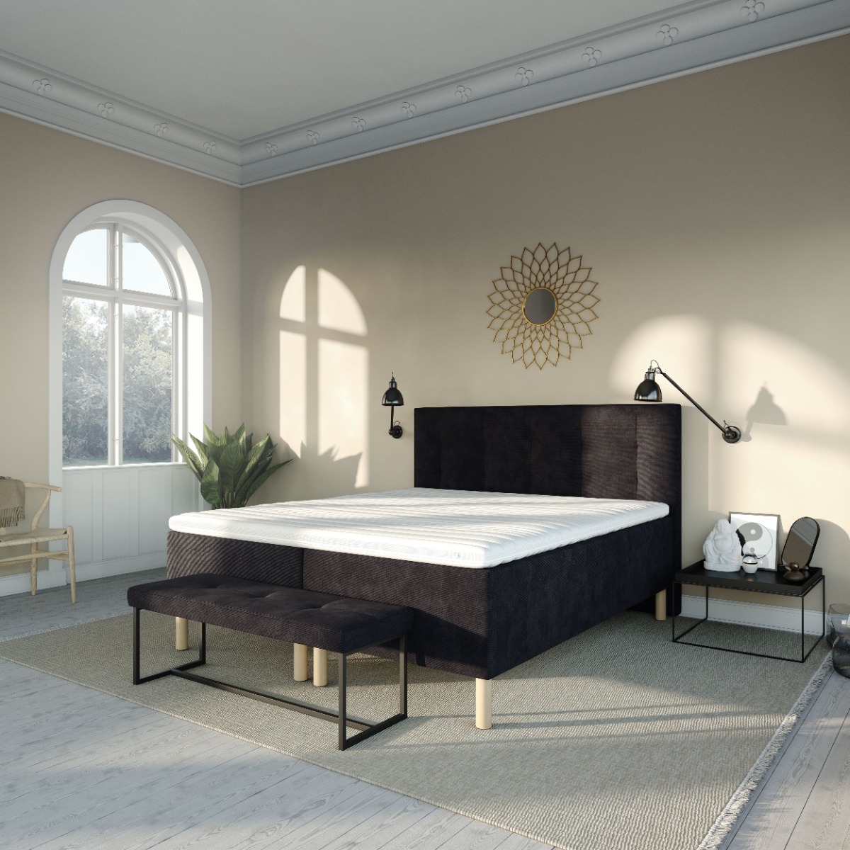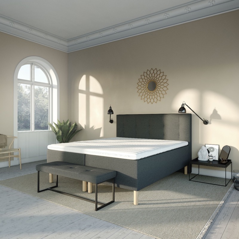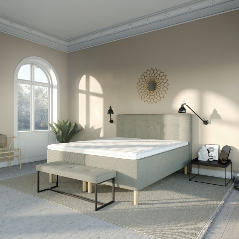 Vår KARMA Lux Continental er bygget på 2 boksmadrasser og deretter 2 vendbare madrasser. Kontinentalmadrassen er bygget på en 12 cm treramme, og har en boks nederst med pocketfjærer og er tilgjengelig med 25 mm Cooltex Breeze eller 25 mm latekspolstring. Den vendbare madrassen har en 7-soners pocketfjær og kommer igjen med enten 25 mm Cooltex Breeze eller latekspolstring. Hele sengen er trukket med vakkert møbeltekstil med sklisikring i speilet.