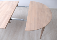 Et minimalistisk, rundt spisebord i oljet eik med mulighet for 1 ileggsplate. Bordet har en praktisk uttrekk-funksjon og kan enkelt gjøres større ved behov.
