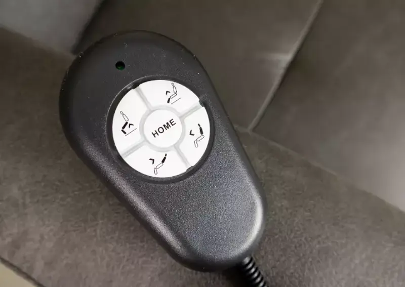 En håndkontroller skjules normalt i sidelommen, med den kan du justere rygg, fotskammel og nakkepute individuelt takket være de flere elektriske motorer i stolen.